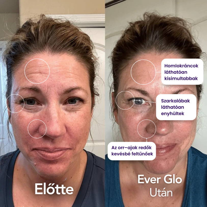 Az Ever Glo egy új, otthon alkalmazható megoldás, amely segít láthatóan enyhíteni a ráncok és finom vonalak megjelenését az arcon, a száj körül és a nyakon, kortól és bőrtípustól függetlenül, klinikai beavatkozások nélkül, 90 napos pénzvisszafizetési garanciával.
